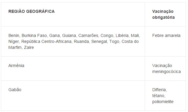 De acordo com as regras internacionais, a única vacinação obrigatória é contra a febre amarela. A falta desta vacinação pode causar proibição da entrada a determinados países.