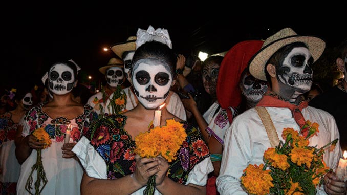 Os mexicanos celebram a data um jeito completamente diferente. Entre os dias 30 de outubro e 2 de novembro, o Dia dos Mortos é uma celebração alegre e em família, para receber bem os antepassados que partiram. O festival, geralmente muito colorido, conta com fantasias, caveiras, flores. A diversão é tanta que promete animar a todos.